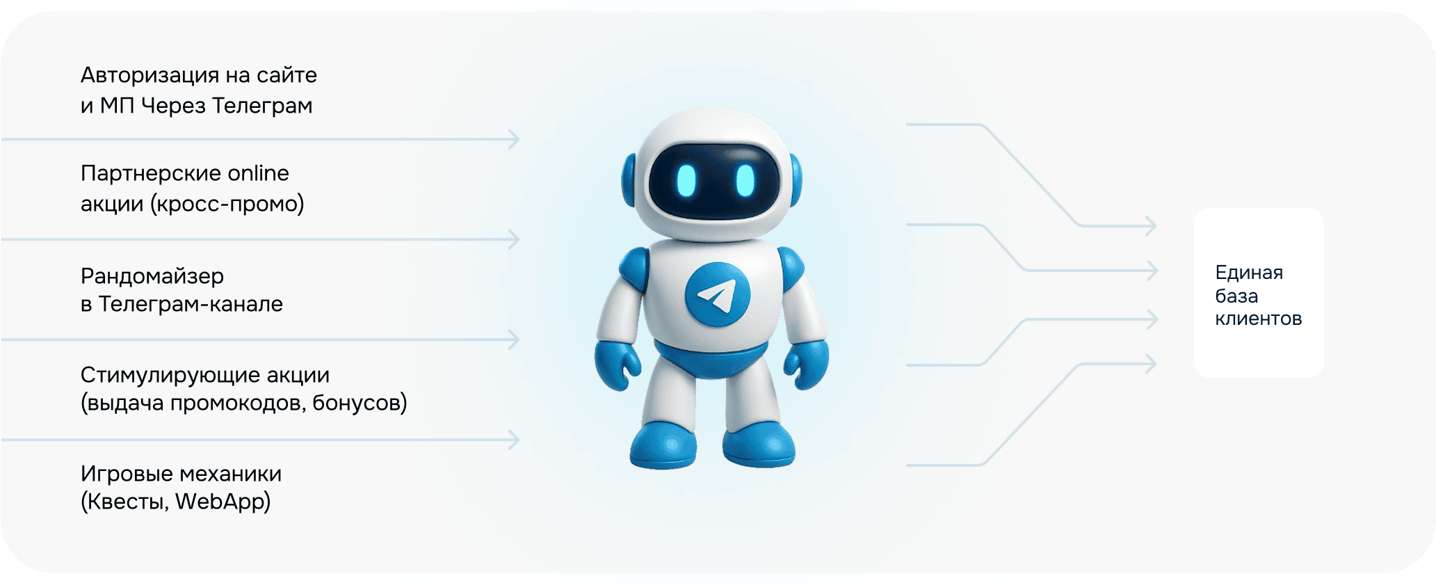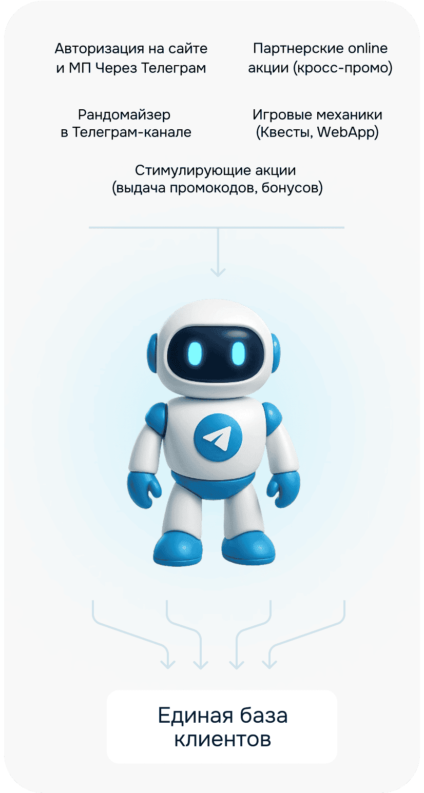 Как это работает: Платформа tgSERVICES позволяет быстро запустить в телеграм, основные стимулирующие механики, многие из которых вы и сейчас используете для взаимодействия с клиентами,с одной учетной записью в едином Телеграм боте, что позволяет, собрать базу клиентов и коммуницировать с ними в одном месте.